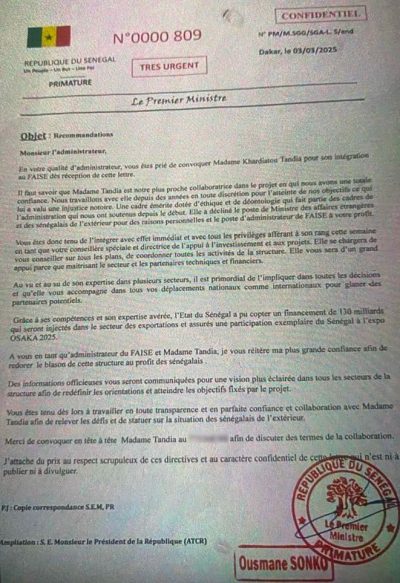 Le document, que nous vous présentons en annexe, est d’une qualité remarquable, avec un cachet, une numérotation et une signature impeccables. Il recommandait l’intégration de Madame Tandia au FAISE avec des privilèges spéciaux, la présentant comme une proche collaboratrice du Premier ministre.